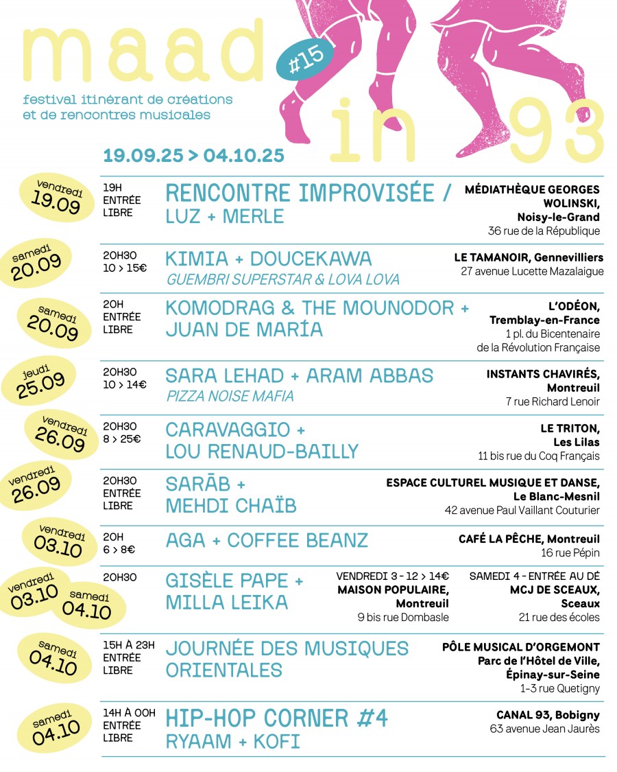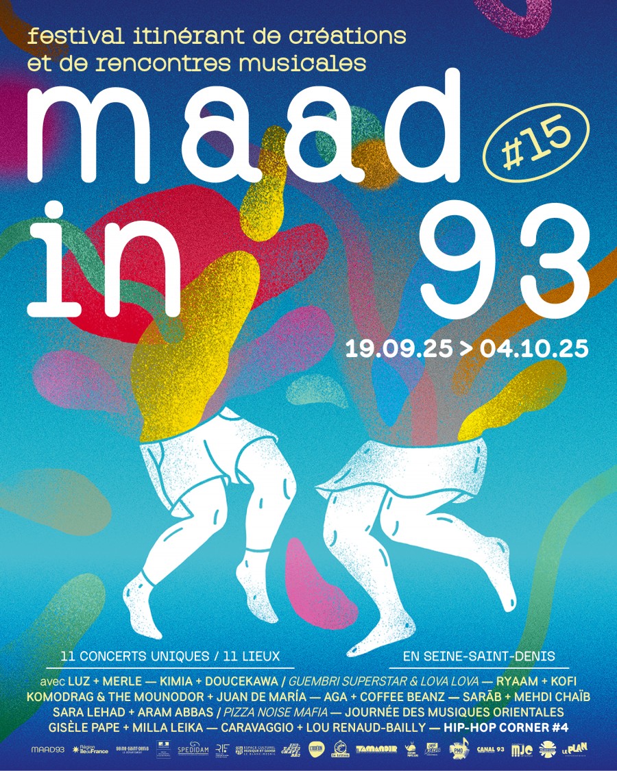 15 ans déjà pour le MAAD in 93 - notre festival itinérant de créations et de rencontres musicales ! Du 19 septembre au 4 octobre 2025, laissez-vous surprendre par 11 nouvelles créations inédites dans les salles du réseau du MAAD 93 mais aussi à la MJC de Sceaux, à la Médiathèque Georges Wolinski de Noisy-le-Grand et au Tamanoir de Gennevilliers. La journée de ressource et de rencontre Hip-Hop Corner #4 rejoint également la programmation à Canal 93 cette année. On a hâte de vous y retrouver !