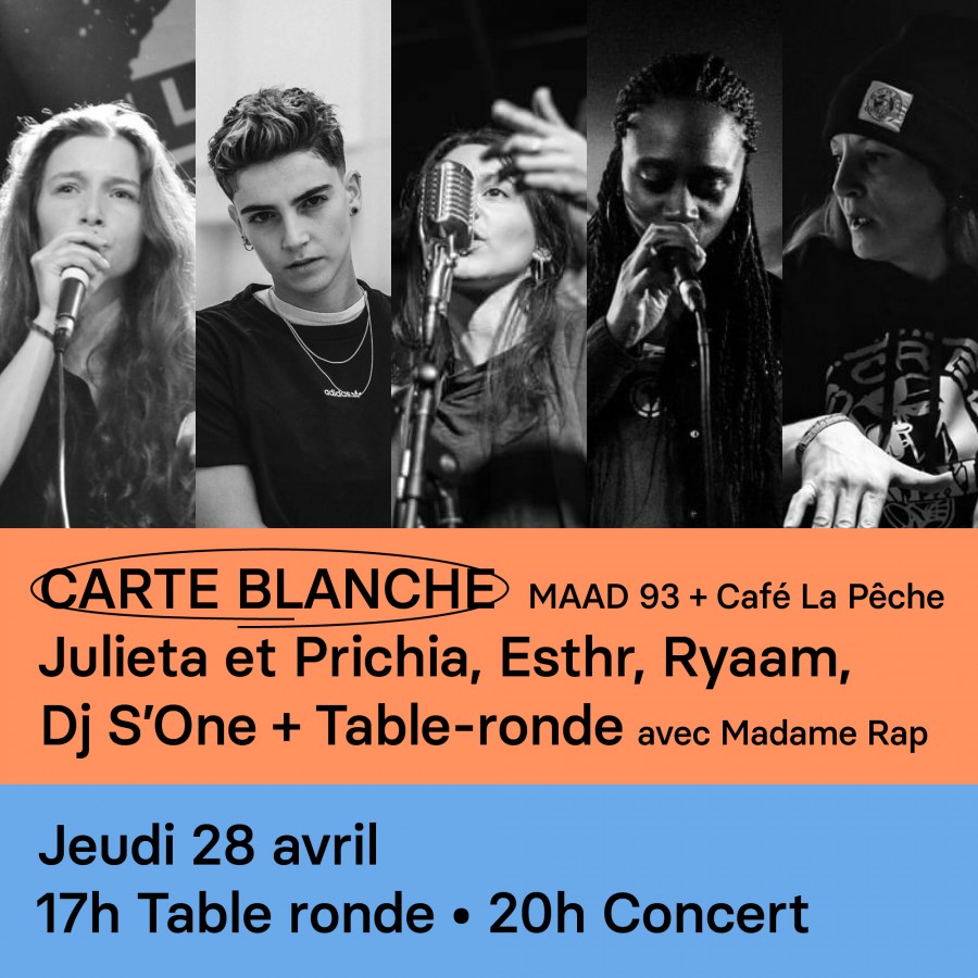 Du 19 au 24 avril, se déroulent à Mains d'Œuvres les Rencontres Urbaines, un évènement visant à réunir les différent.e.s acteur.ice.s des cultures urbaines du territoire de Plaine Commune. À cette occasion, le MAAD 93 et le Café la Pêche proposent un focus sur les musiques urbaines le 28 avril avec au programme une table ronde organisée par Madame Rap, les beat-boxeuses Julieta et P