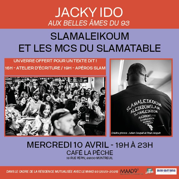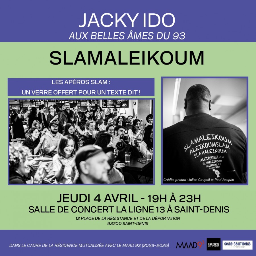 Les apéros-slam, nommés “Slamaleikoum”, ont été pensés pour créer à travers le slam un moment de partage unique en permettant à chacun.e de prendre d’assaut la tribune, et d’offrir un petit bout de soi, quel que soit son parcours.Ces apéros-slam sont organisés dans le cadre de la résidence artistique de Jacky Ido, "Aux belles âmes du 93" portée par le MAAD 93 de 2023 à 2025.