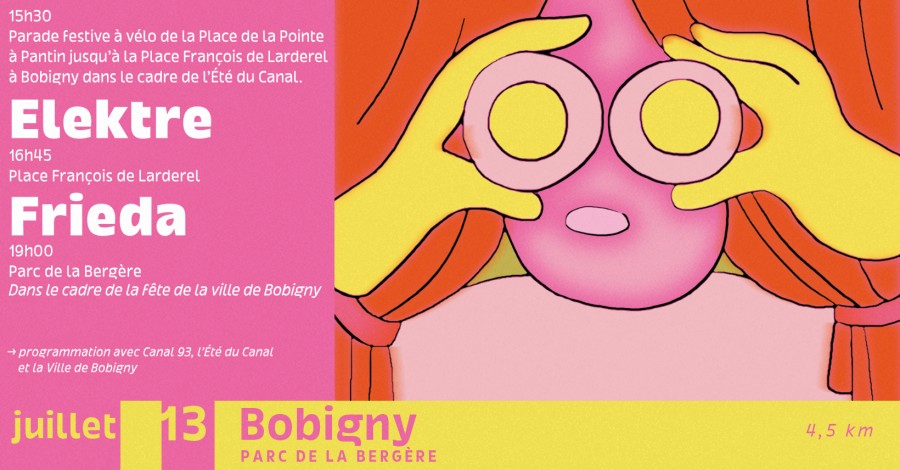 Samedi 13 juillet, les Scènes Nomaades rejoignent la fête de la ville de Bobigny et les animations de l'Été du Canal ! Rejoignez-nous à vélo pour une parade festive au départ de la Place de la Pointe à Pantin qui vous amène à Bobigny pour les concerts d'Elektre et de Frieda.